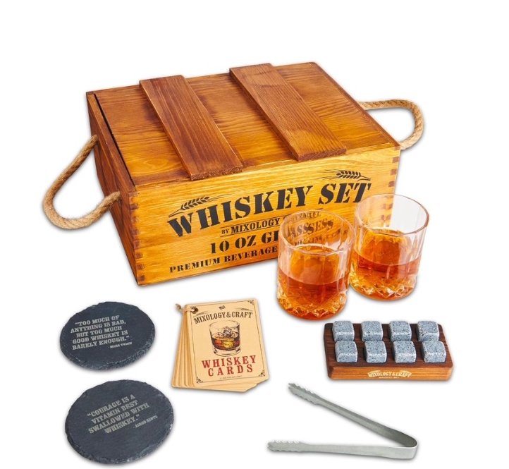 With a passion for the craft of whiskey, the team behind Mixology & Craft set out to create an exceptional line of products tailored specifically to whiskey enthusiasts. Their collection includes handsome oak boxes containing whiskey stones, glasses, coasters, and tools to enhance the whiskey ritual.